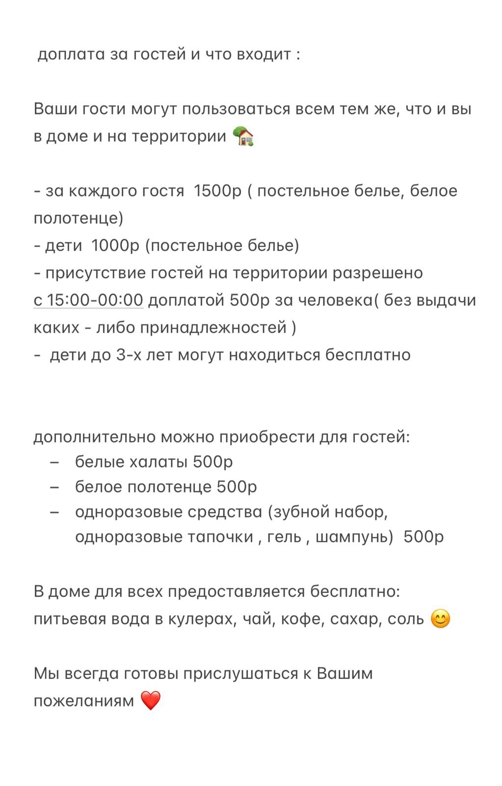 100 кв.м, 2-х этаж, спальных мест на 6 чел, кухня, вся бытовая техника и посуда, телевизор, колонки, проектор, вай-фай, батут игрушки для детей, бассейн теплый , сауна , фурако, мангальная , беседка, зона костра, парковка. Дом на 10 персон. Стоимость для ДВОИХ, далее по 1500 рублей - дети до 3- х лет бесплатно , после 1000р САУНА 2000р ( 2 часа) , Фурако 4000₽ (безлимит).
