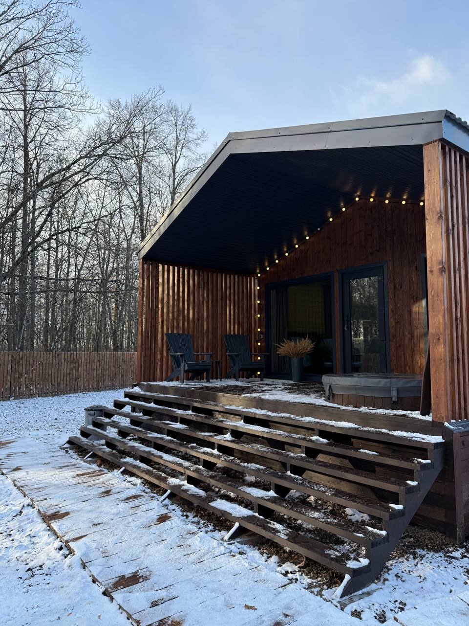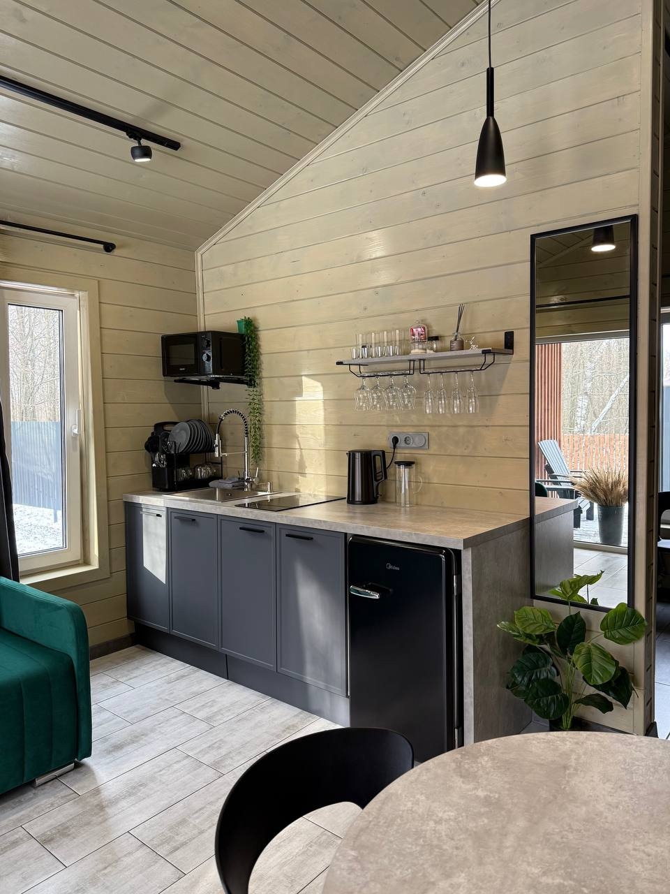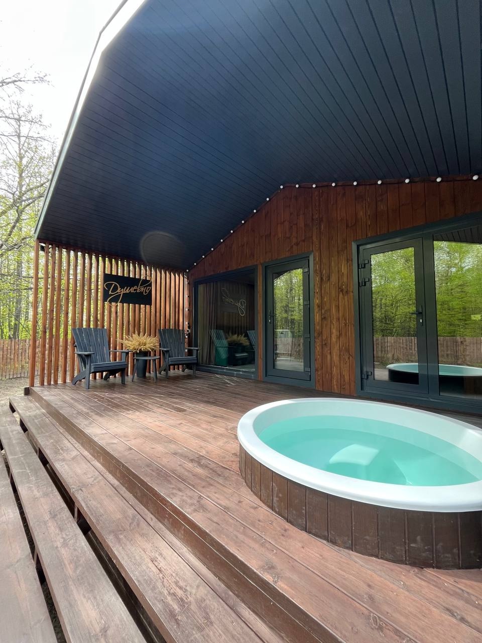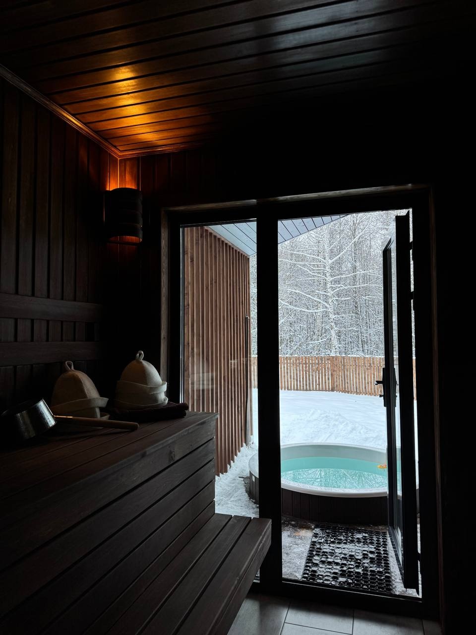 Дом 40 кв.м., по всему дому теплые полы , стол на 4 персон , кухня, вся бытовая техника и посуда, плазма, вай-фай , двух спальная кровать, диван раскладной, баня с панорамным видом в лес, с выход в фурако, терраса, мангальная зона, парковка, рядом лес. ( Баня без веников) Фурако на террасе под крышей (Входит в стоимость)