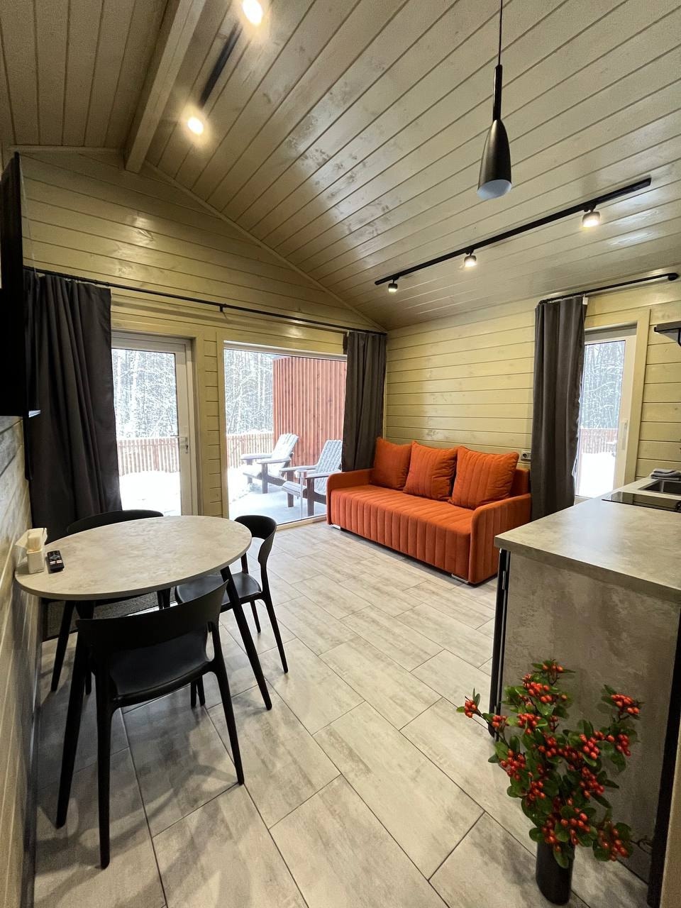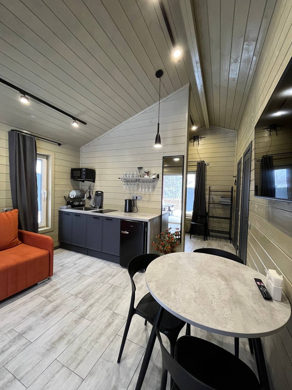 Дом 40 кв.м., по всему дому теплые полы , стол на 4 персон , кухня, вся бытовая техника и посуда, плазма, вай-фай , двух спальная кровать, диван раскладной, сауна с панорамным видом в лес с выходом в фурако, терраса, мангальная зона, парковка, рядом лес. ( Сауна без веников) Фурако на террасе под крышей (Входит в стоимость)