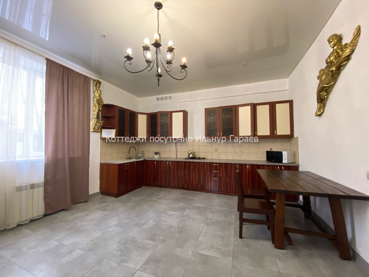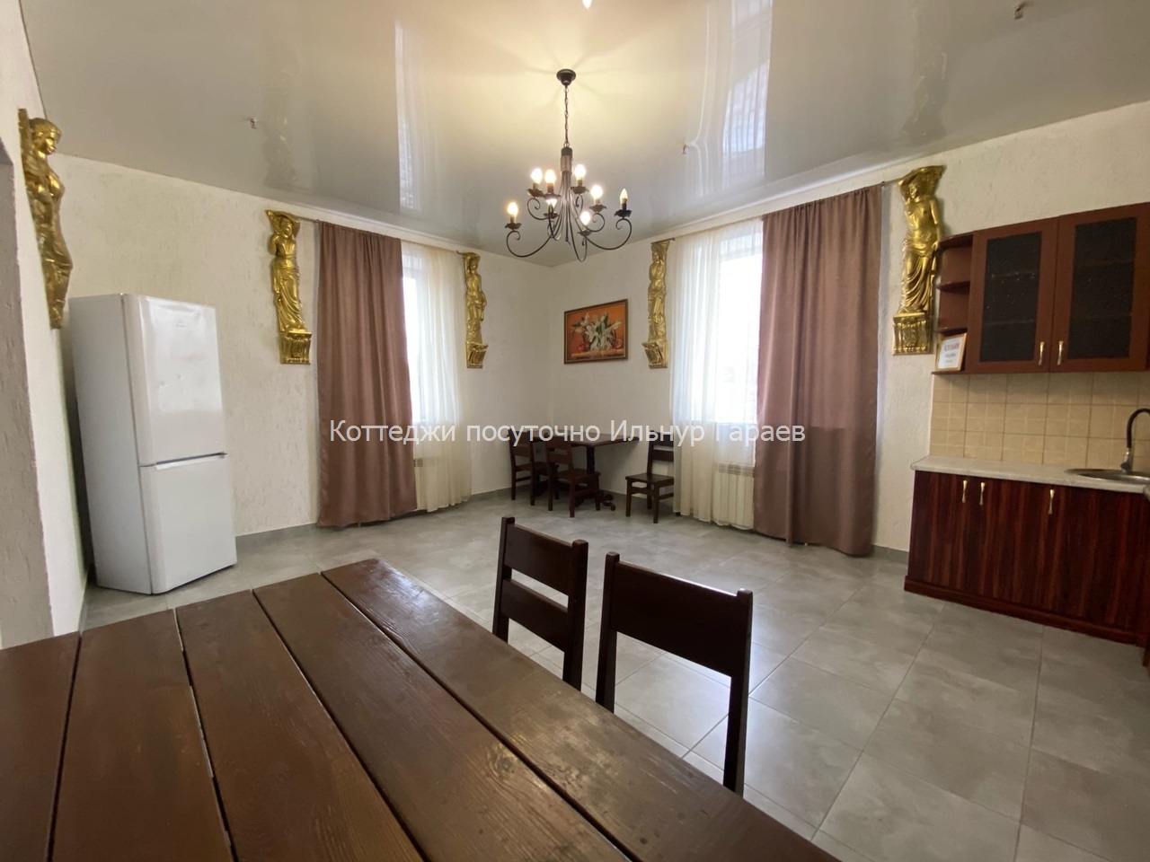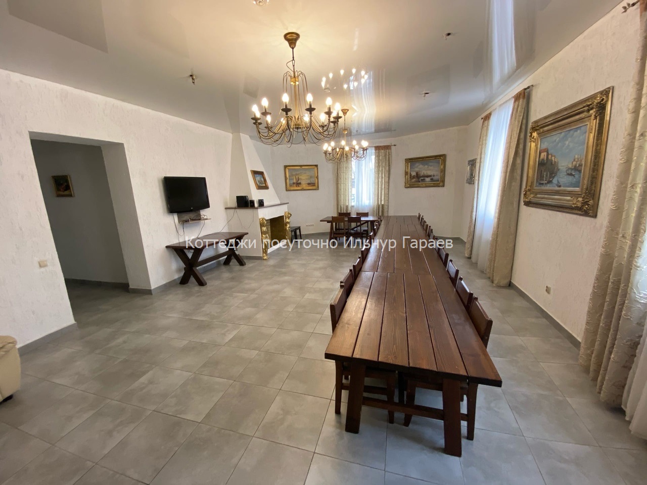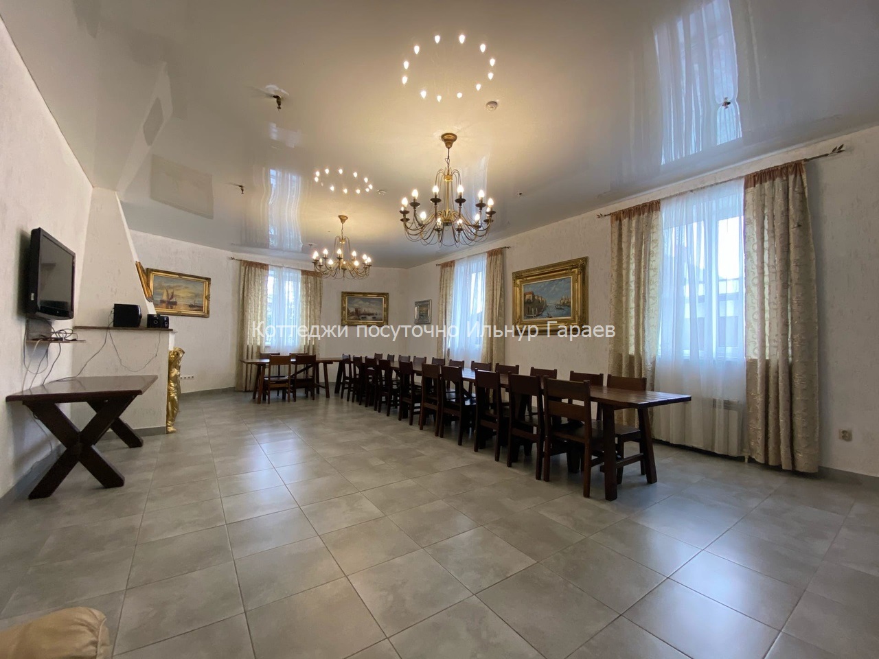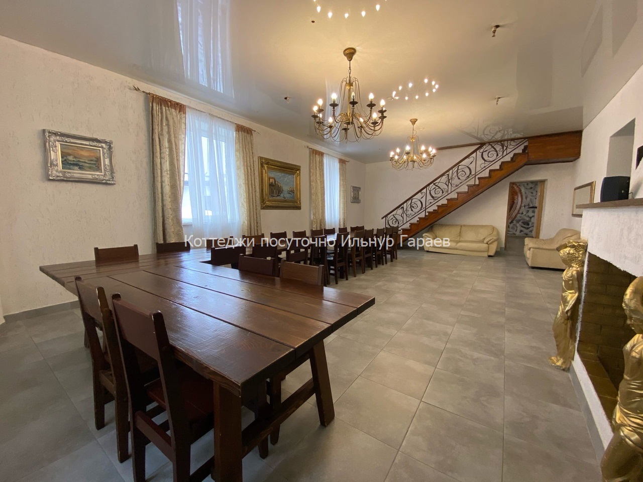 Современный коттедж двух этажный, площадью 400 кв.м. Банкетный зал 30 человек, ( максимум 50) камин, тв, , сауна, бассейн (10X3) , 5 спален + 2 гостиные. ( 24 спальных мест). Во дворе: беседка до 25-30 человек,мангал для приготовления плова и шашлыка, парковка на 6 машин.