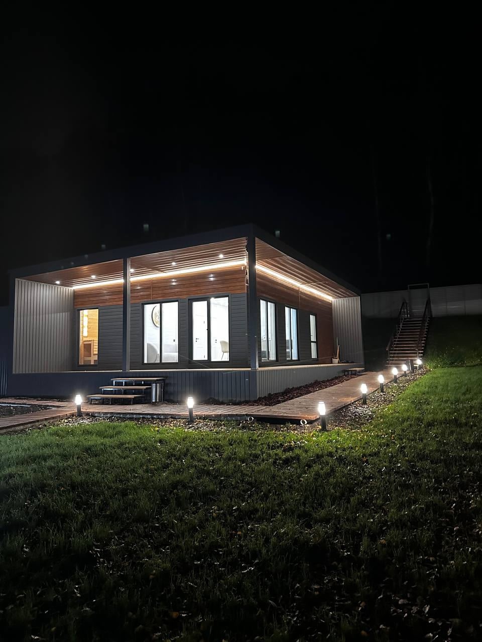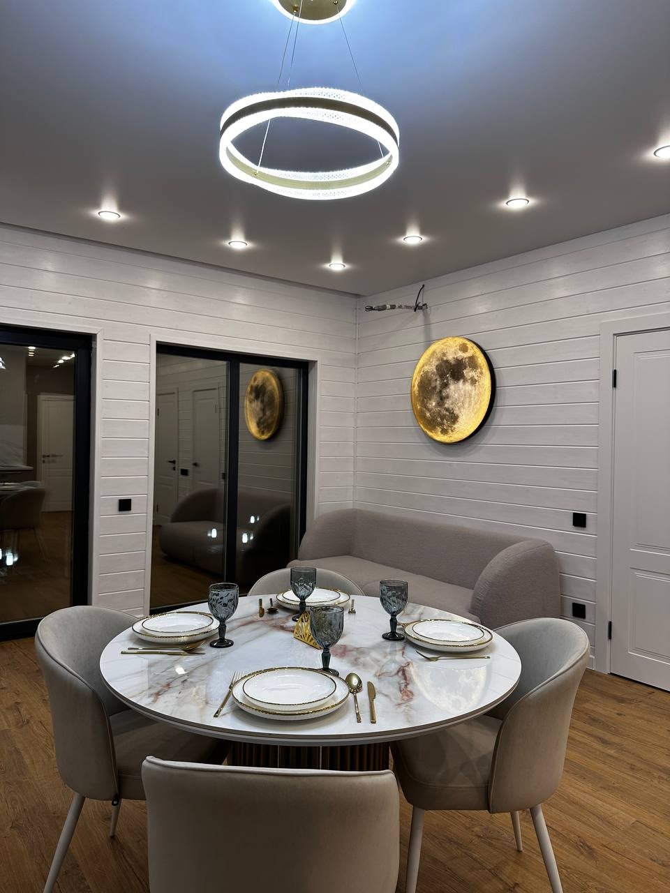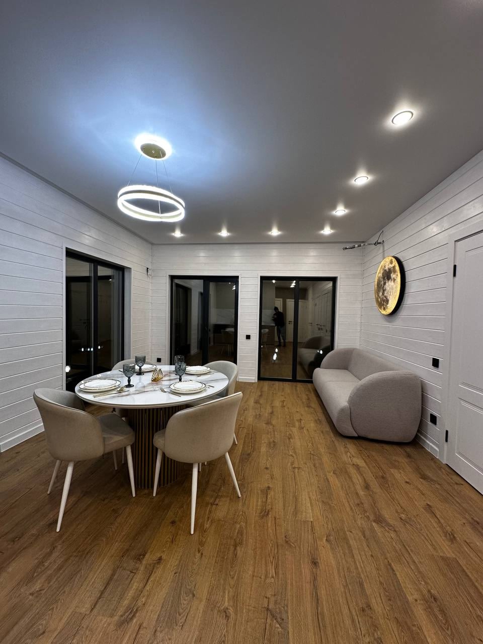 Дом с терассой 100 кв. м., одноэтажный, по всему дому тёплые полы , 2 уютные спальни , 5 спальных мест, + двухспальный надувной матрас , кухня ( вся бытовая техника, холодильник, микроволновка, чайник и красивая посуда), отдельный с/у, зеркало с подсветкой ,фен, стиральная машина ,( одноразовые зубные щётки) душевая, полотенца и халаты ( 2 шт) , сауна с панорамным окном : можжевельник и солевые камни. Просторная гостинная, круглый стол из керамогранита на 6 персон, мягкие стулья, диван, а над ним луна с подсветкой, плазма ( подключено платный канал иви) , музыка через блютуз, выход на террасу , фурако безлимит , качели , песочница , мангальная зона под навесом ( решётки и шампура). Парковка за территорией. Рядом лес Данный дом сдаётся до 4- х взрослых + 3-4 детей. Закрытая территория Все включено ( фурако и сауна ) Стоимость для двоих далее по 1500₽ Дети до 15 лет бесплатно