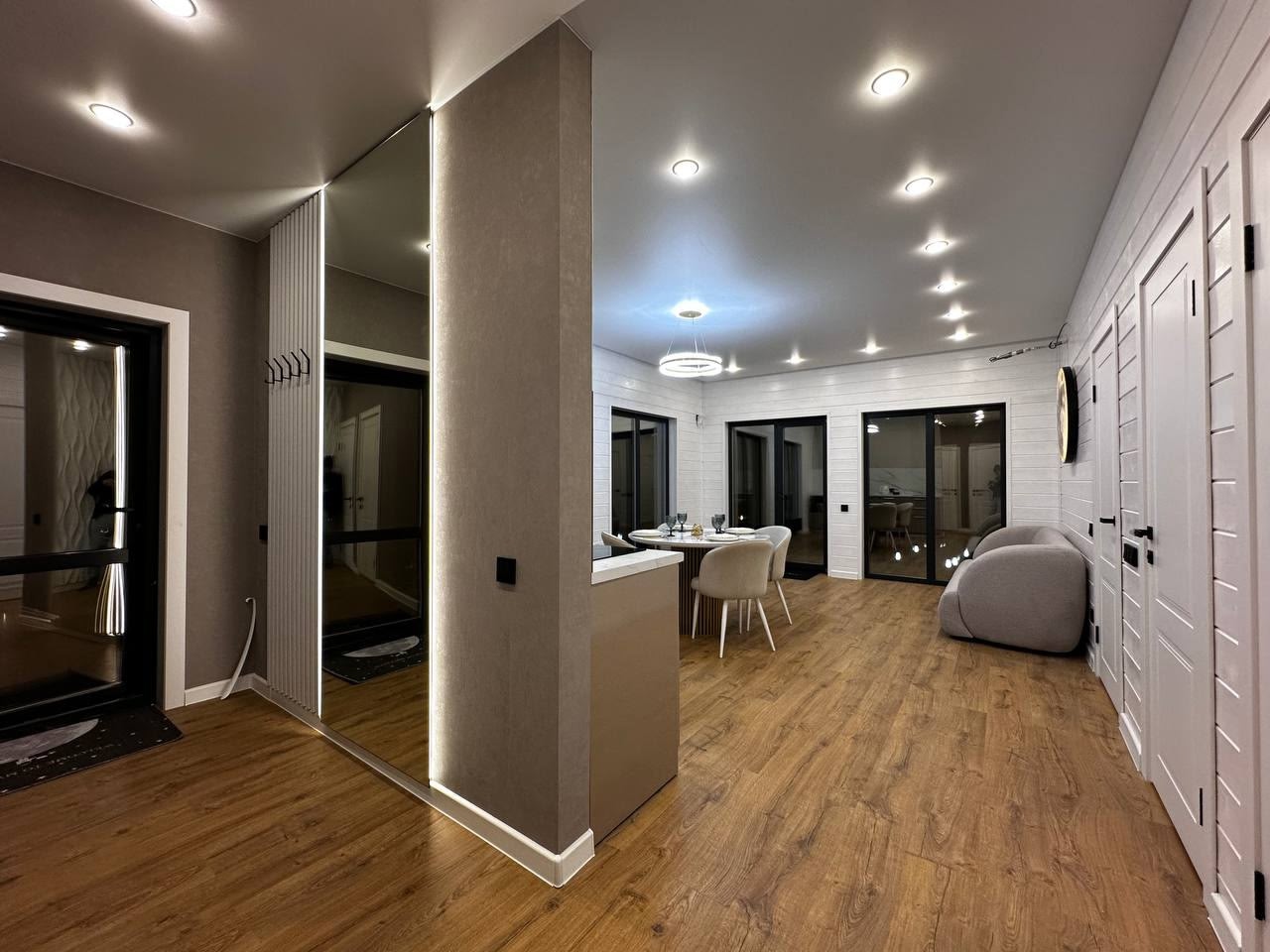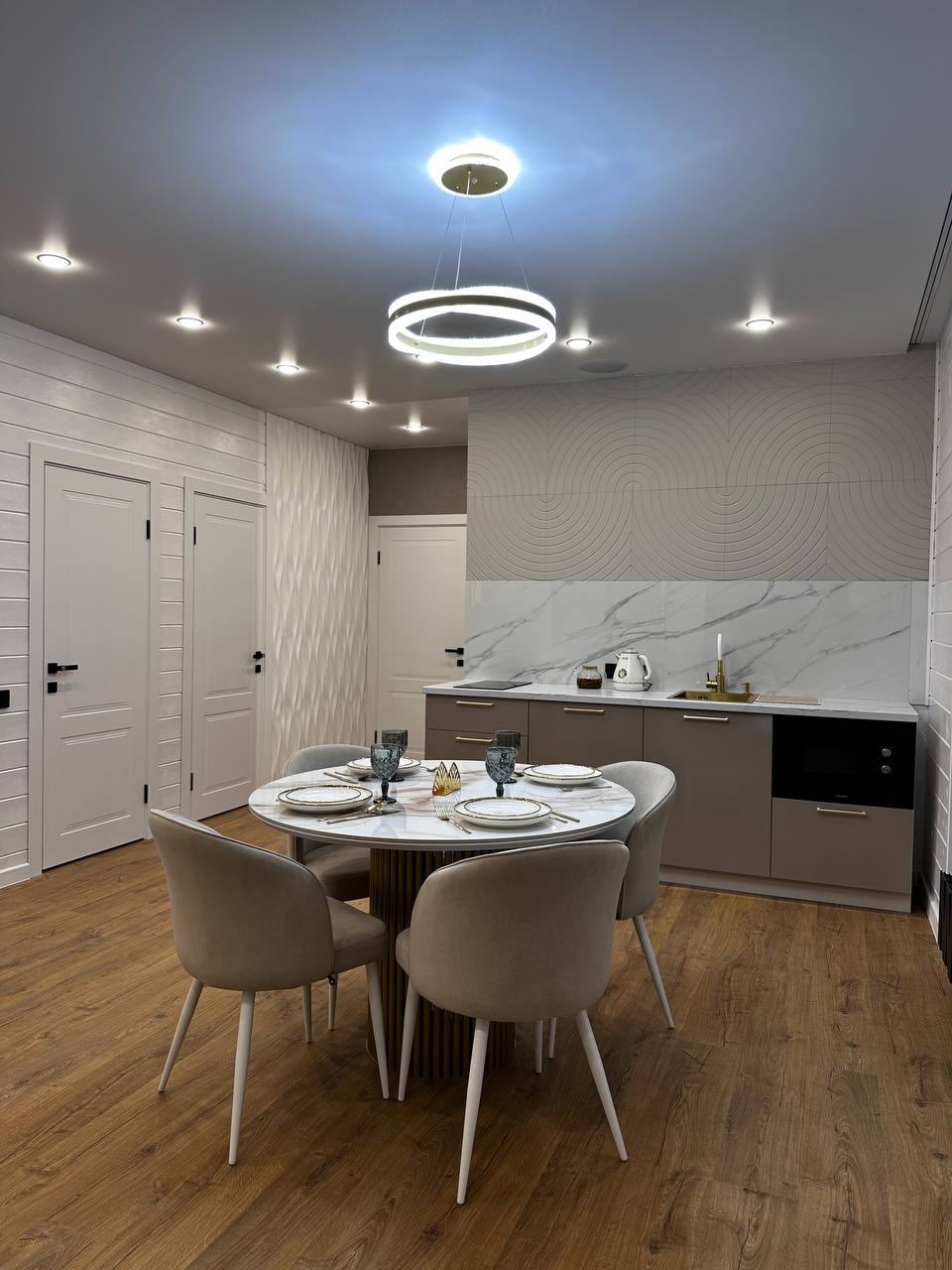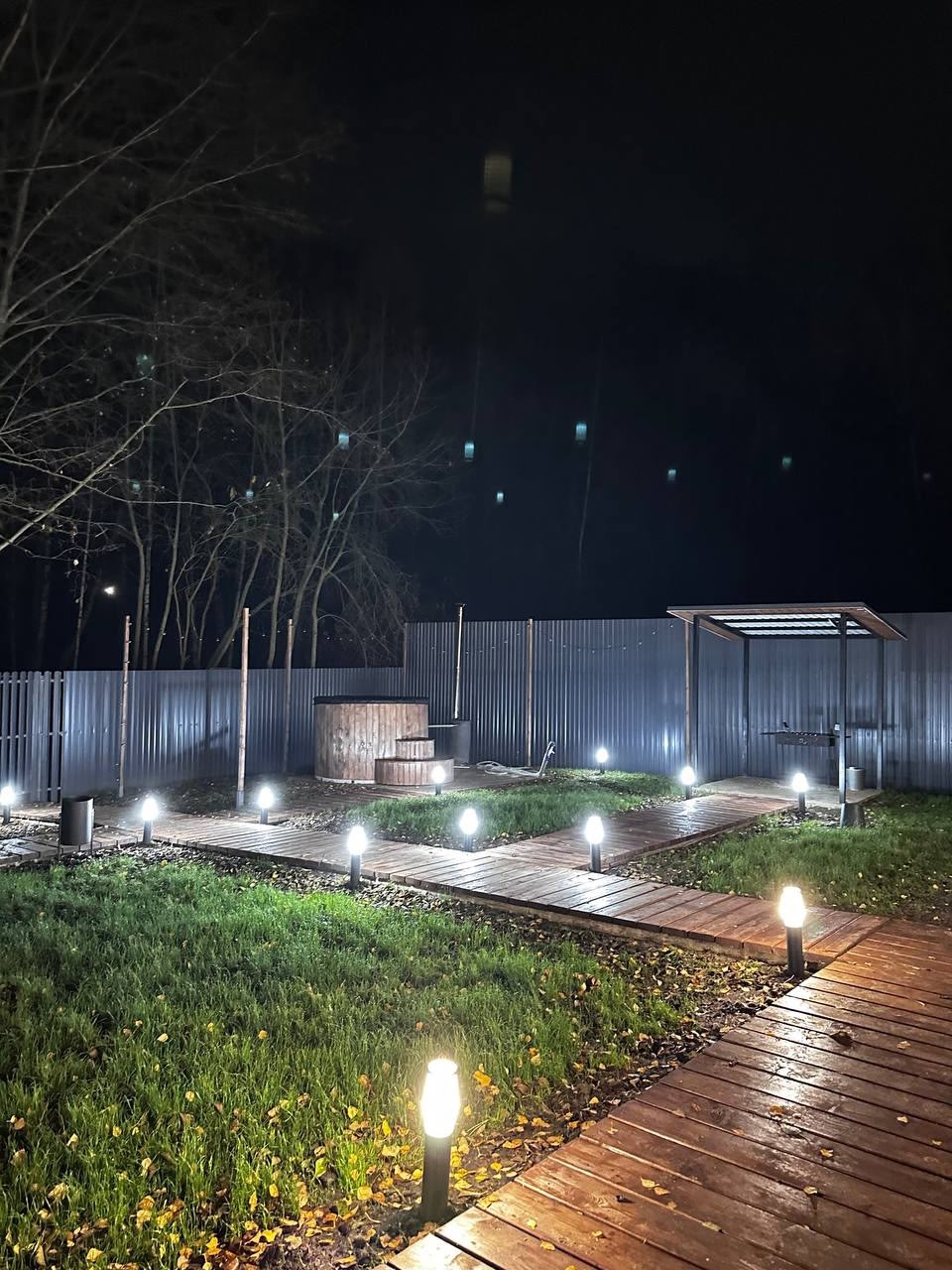 Дом с терассой 100 кв. м., одноэтажный, по всему дому тёплые полы , 2 уютные спальни , 5 спальных мест, + двухспальный надувной матрас , кухня ( вся бытовая техника, холодильник, микроволновка, чайник и красивая посуда), отдельный с/у, зеркало с подсветкой ,фен, стиральная машина ,( одноразовые зубные щётки) душевая, полотенца и халаты ( 2 шт) , сауна с панорамным окном : можжевельник и солевые камни. Просторная гостинная, круглый стол из керамогранита на 6 персон, мягкие стулья, диван, а над ним луна с подсветкой, плазма ( подключено платный канал иви) , музыка через блютуз, выход на террасу , фурако безлимит , качели , песочница , мангальная зона под навесом ( решётки и шампура). Парковка за территорией. Рядом лес Данный дом сдаётся до 4- х взрослых + 3-4 детей. Закрытая территория Все включено ( фурако и сауна ) Стоимость для двоих далее по 1500₽ Дети до 15 лет бесплатно